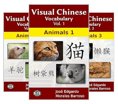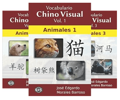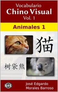 This first volume shows a set of 50 animals, of which, their names are presented in Spanish and Chinese, with their respective romanization (pinyin) and four writing styles in characters (hanzi).
